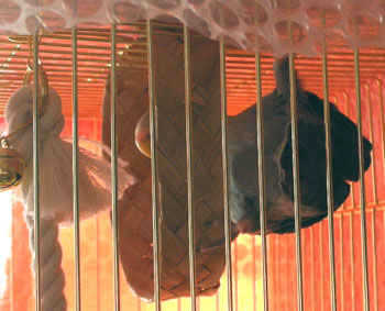 ゲージにかけてある布とゲージの隙間に潜り込んでモゾモゾ蠢いています。